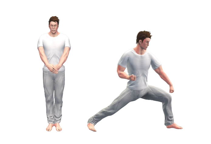 一礼の後 ①結び立ちの姿勢から始まります。 ②左に向きを変え、前屈立ちで左下段払い